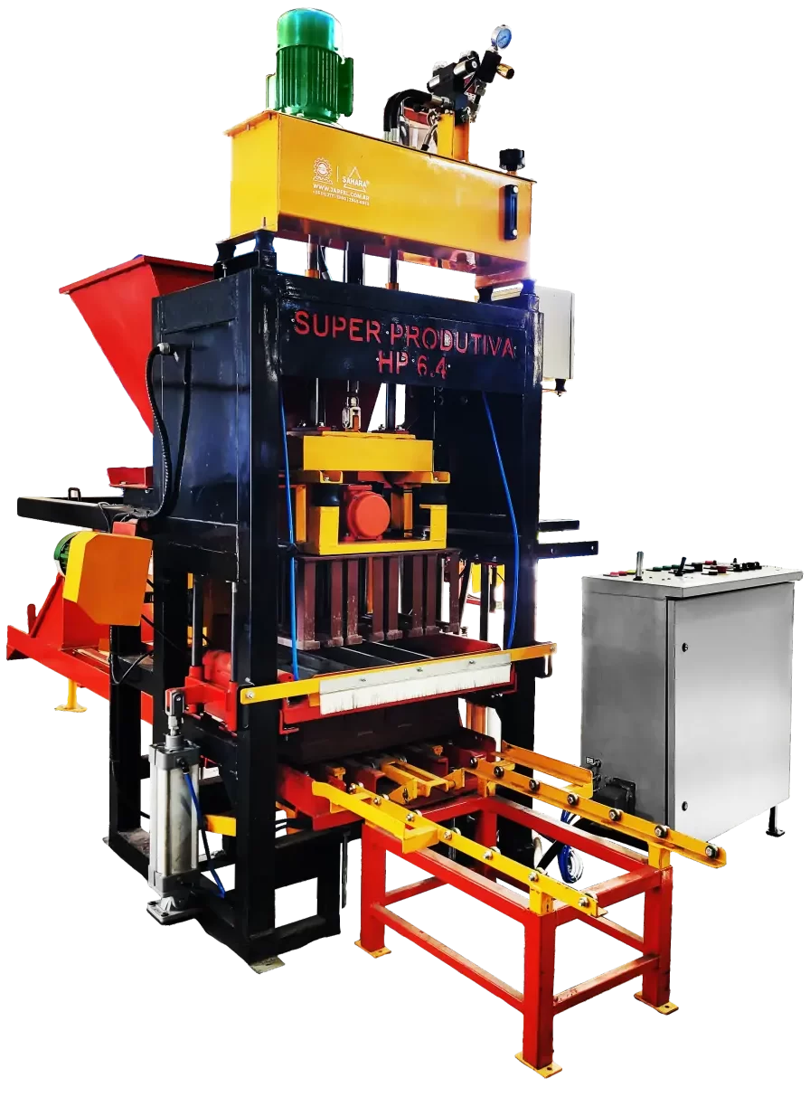 A Máquina de pavers e blocos Super Produtiva HP 6.4 é mais do que uma simples máquina de blocos de concreto. Com impressionantes 4 toneladas de força de compactação, ela é equipada com dois vibradores Carter lacrados a óleo nas laterais e dois motovibradores na parte superior e inferior da fôrma.